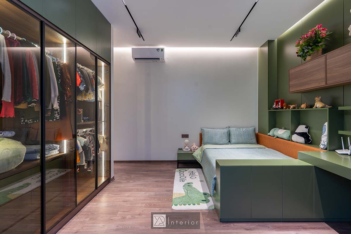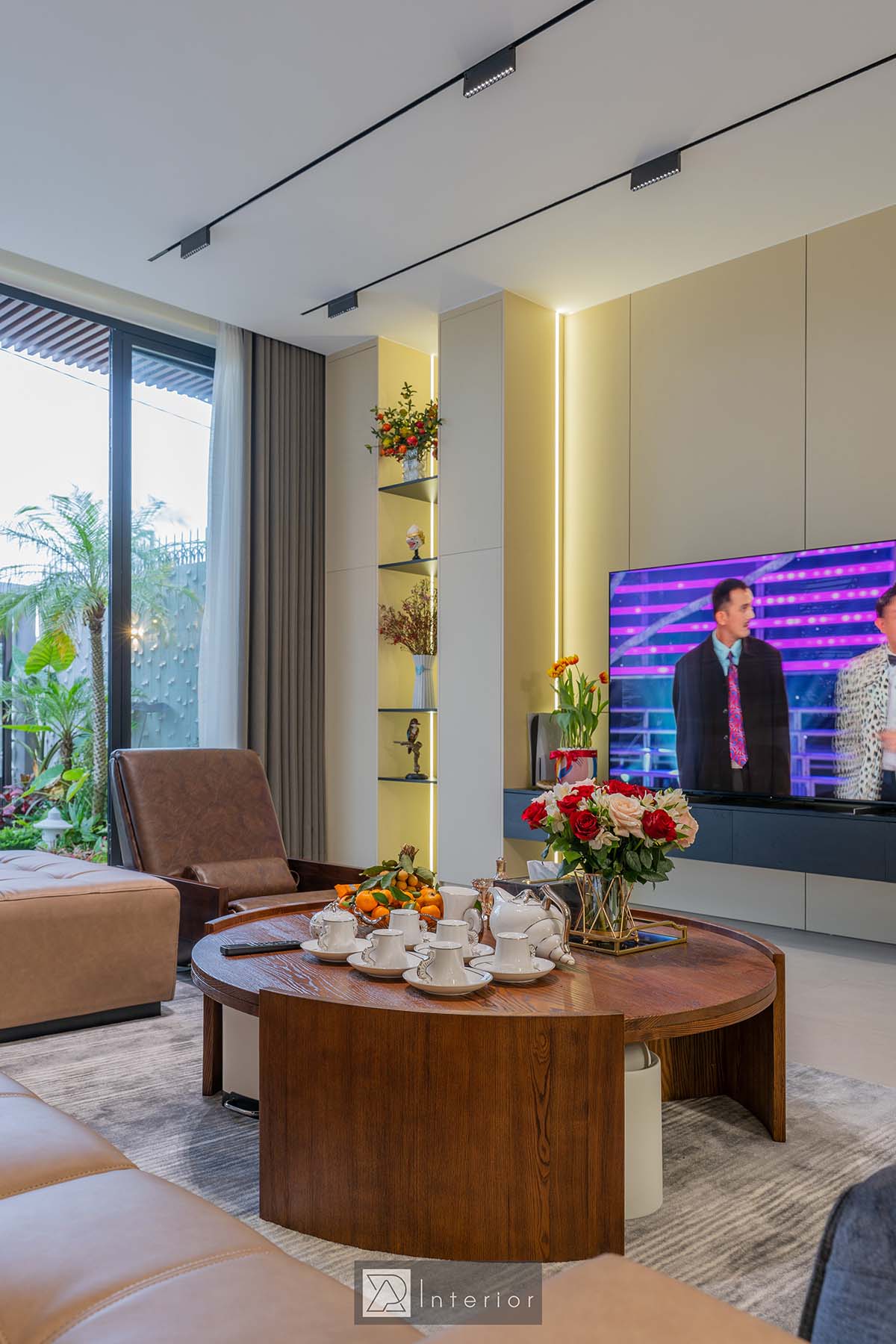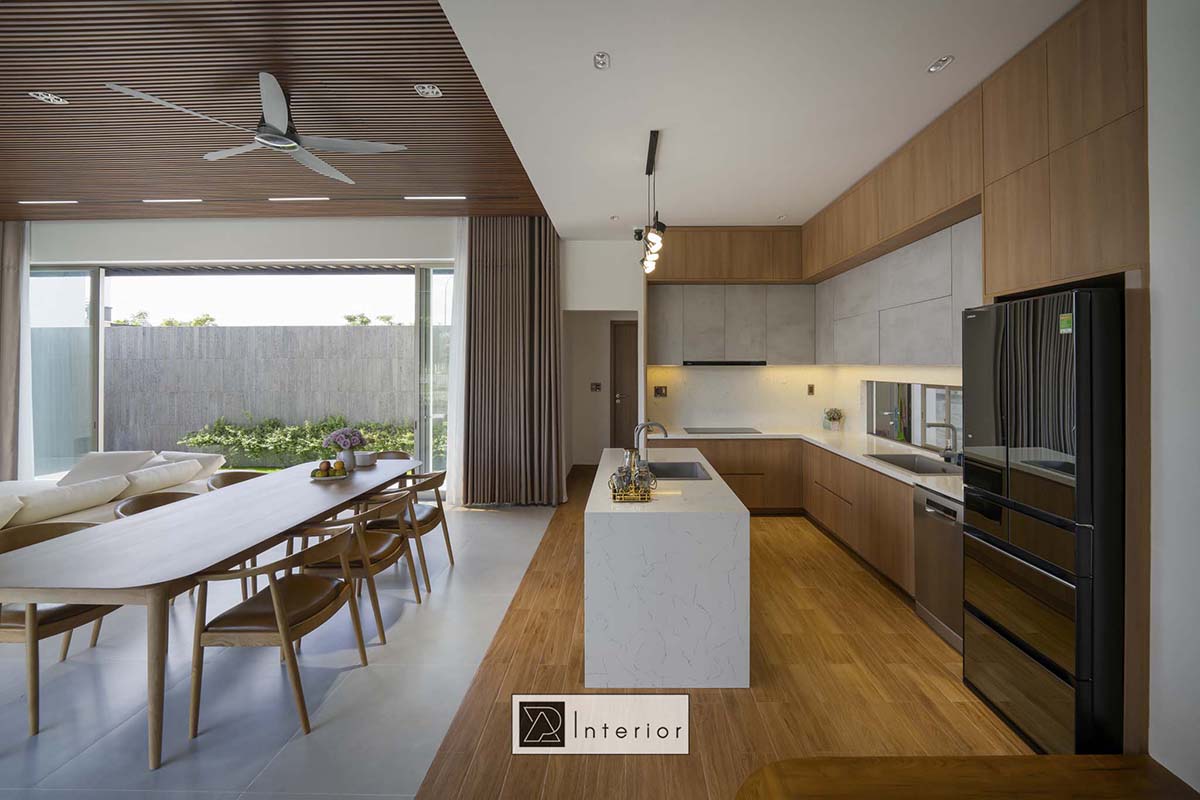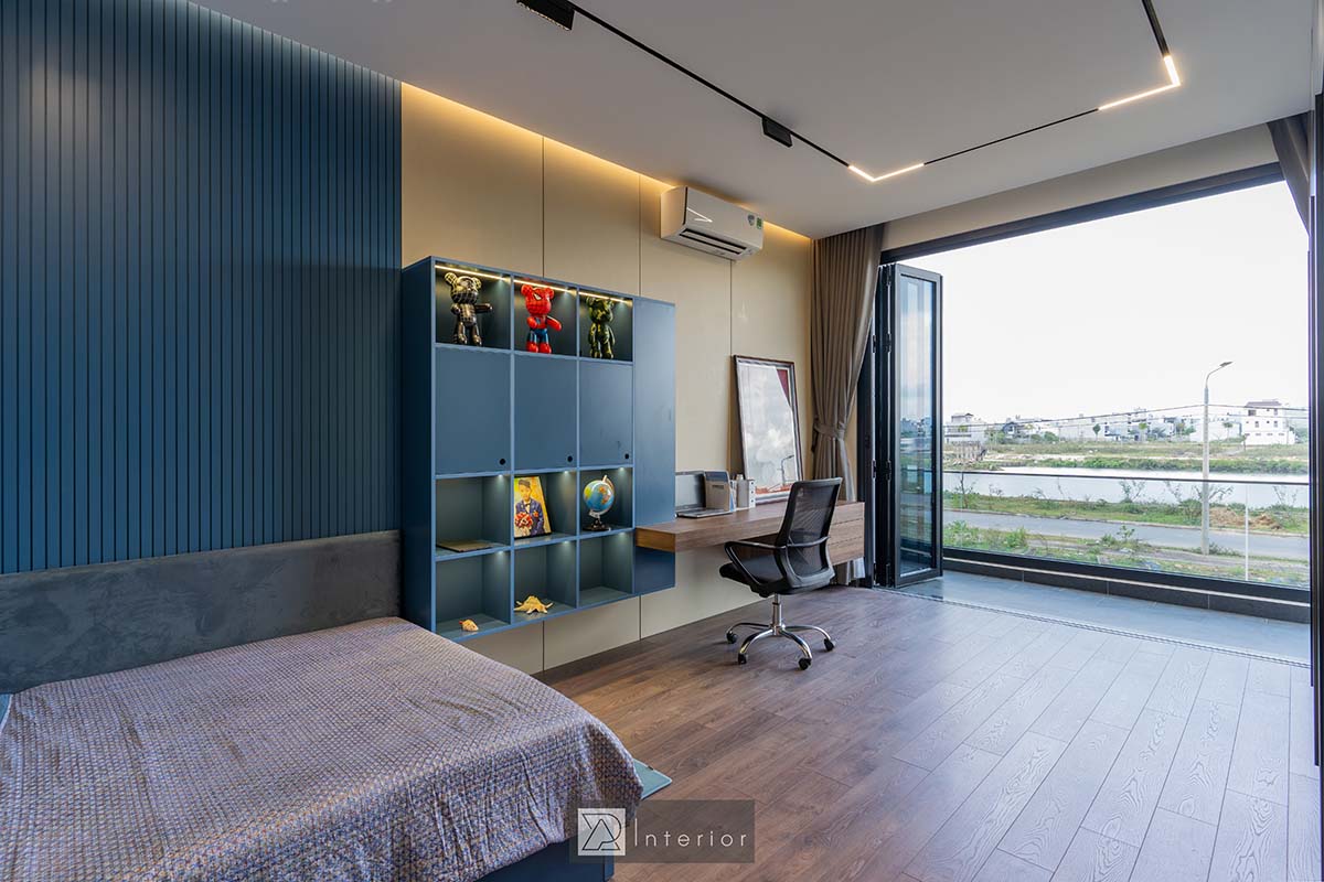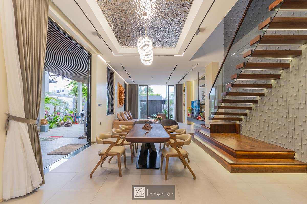 Nổi bật với thiết kế thông tầng tại không gian phòng khách, mảng tường ốp đá tự nhiên vững chãi cùng nghệ thuật phối màu tương phản trở thành điểm...